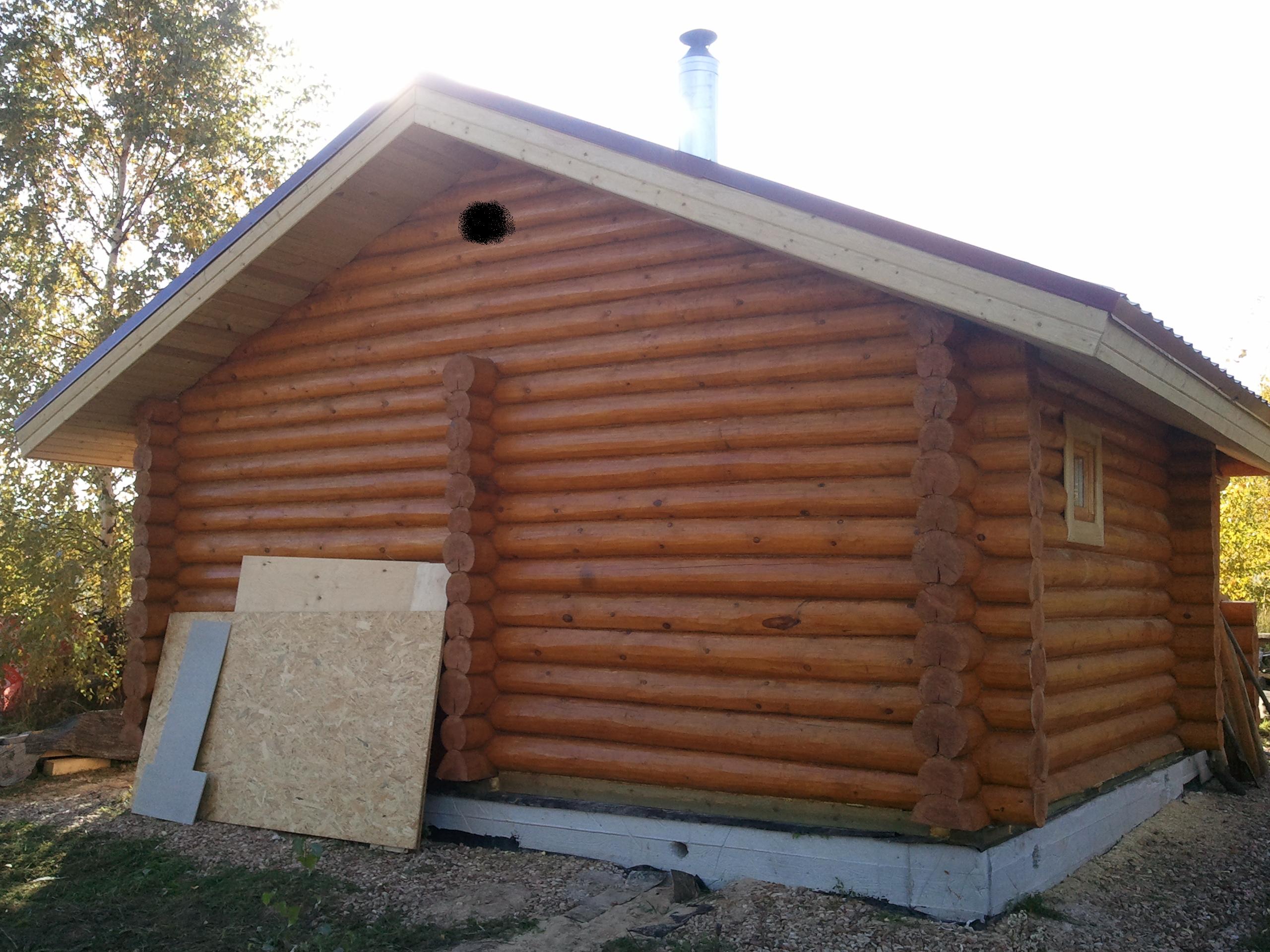 Для наглядности прилагаю общий вид бани, чтобы было понятно о чем идет речь. Но фотке сзади черным кружком отмечено предполагаемое место под "дырку" для вытяжки.