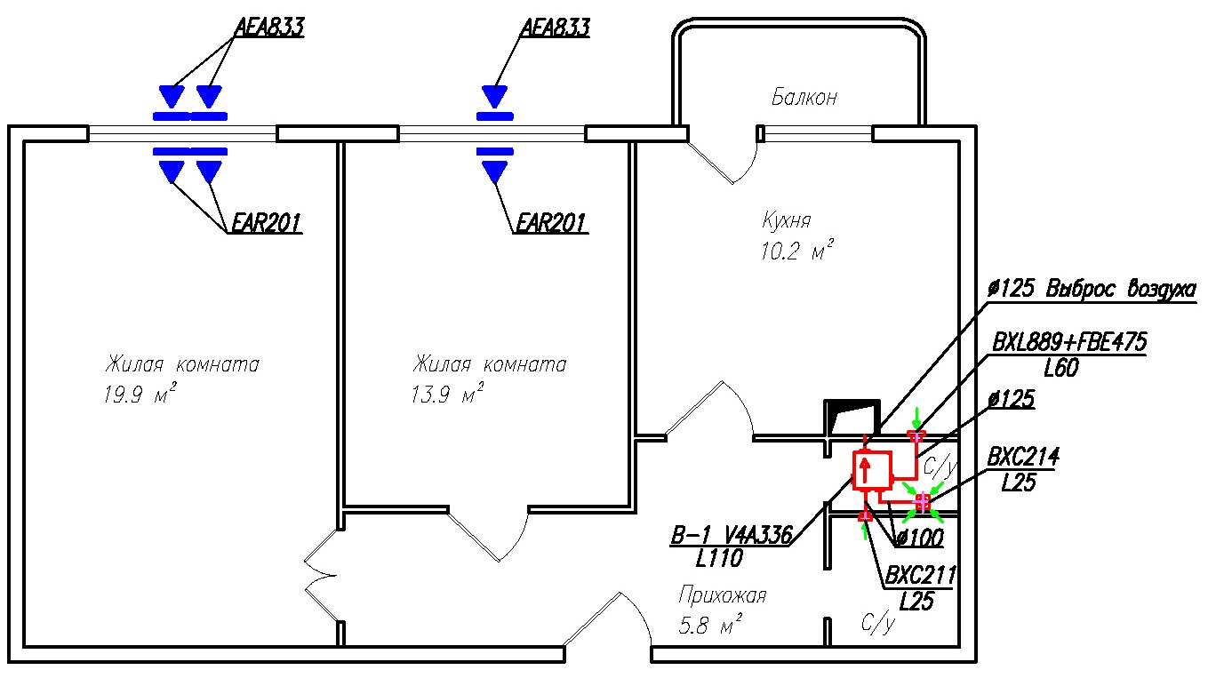 Центральный вентилятор (исходя из параметров Вашей квартиры) , скорей всего мод.V4A336 или мод.VAM767, обычно располагают в подсобных помещениях(ванная, туалет или кухня, скорей всего кроме кухни, поскольку у Вас там предполагается кухонная вытяжка (надплитный зонт).